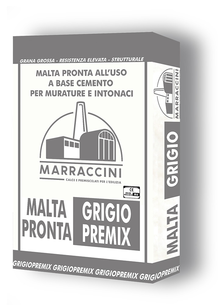 “Grigio Premix” è conforme ai requisiti prestazionali della norma CE UNI EN 998-2:2010 “Malta per muratura a prestazione garantita”, di cat. Md, sistema di attestazione 2+, certificata da organismo notificato.